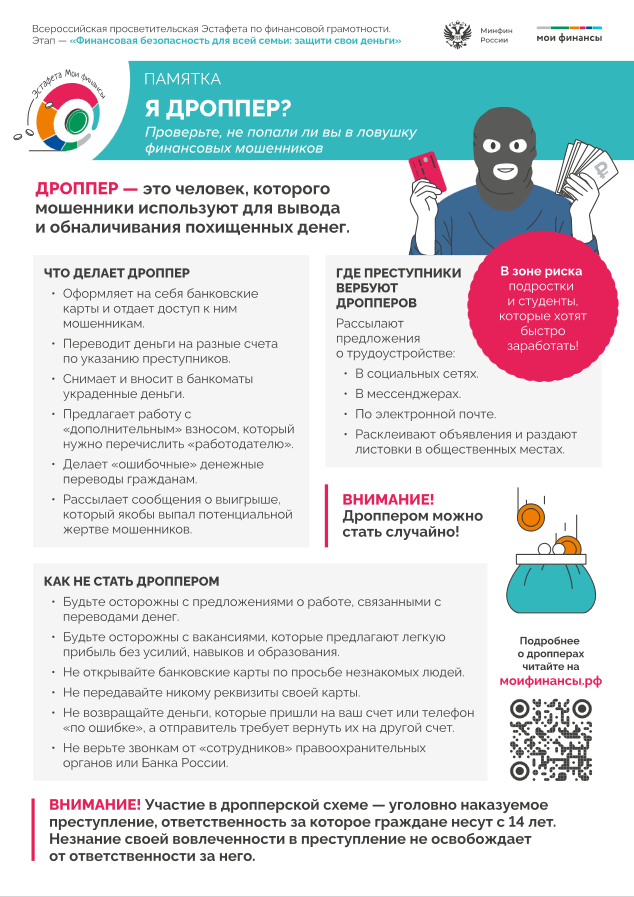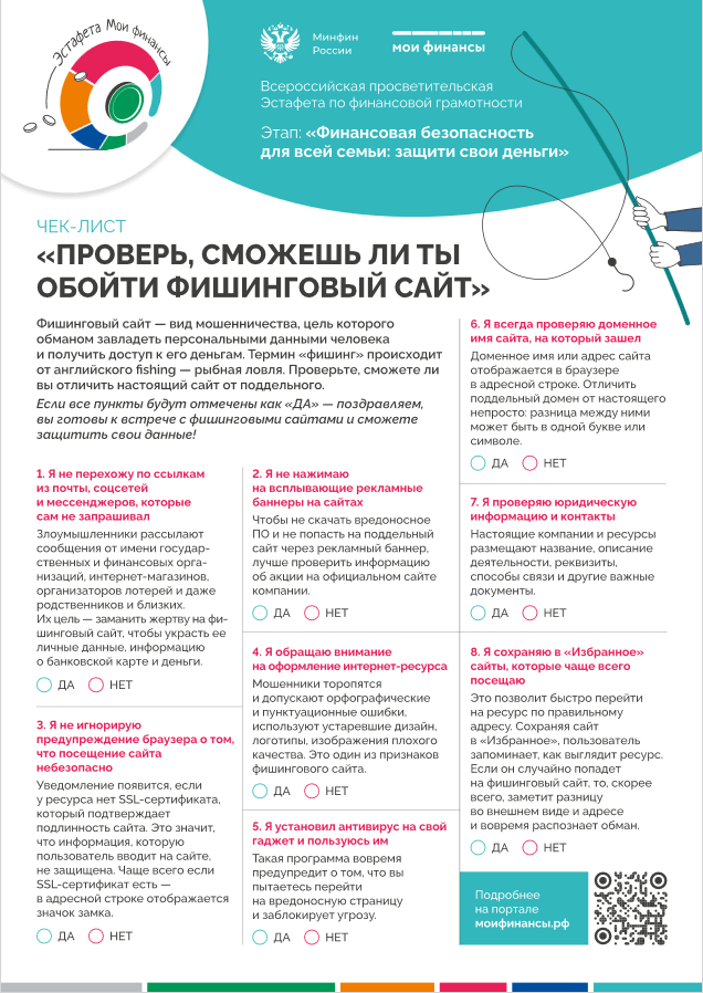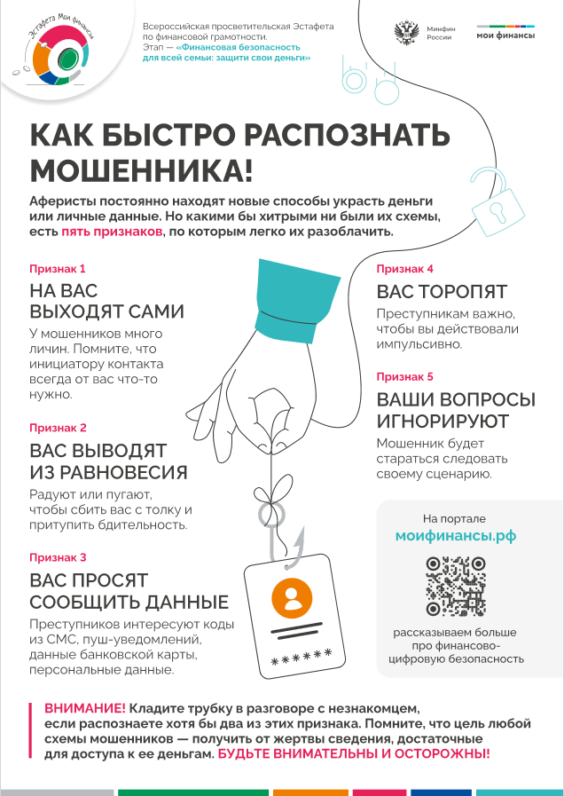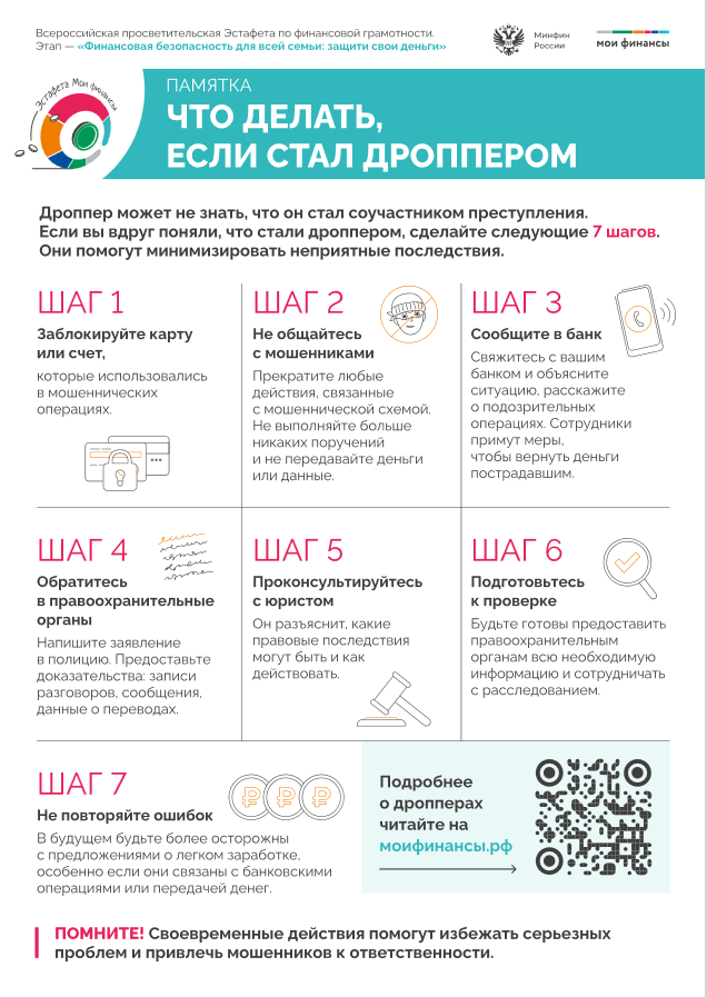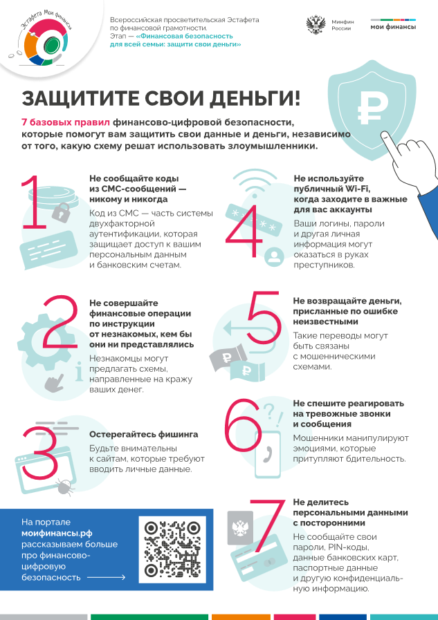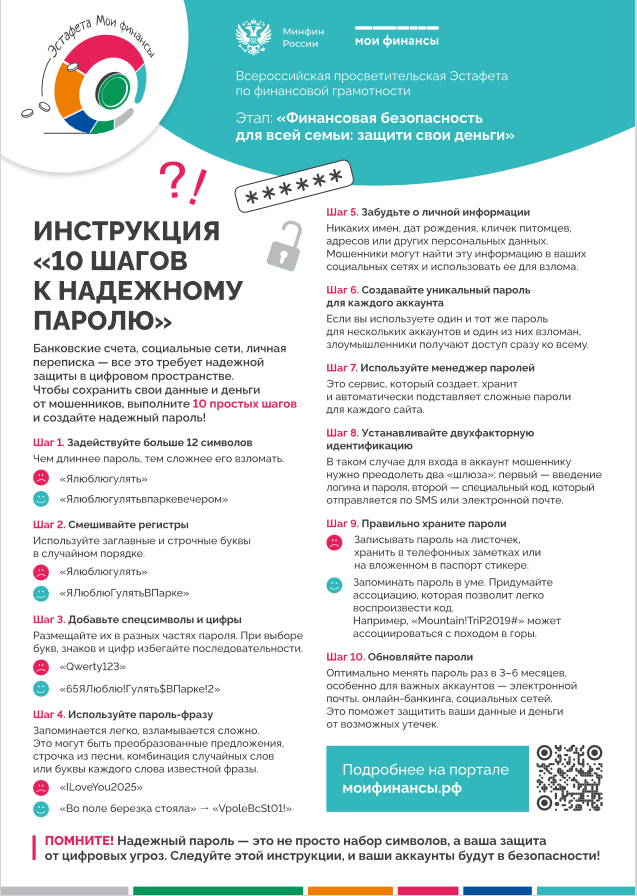18 сентября 2025 года завершается тематический этап Всероссийской просветительной эстафеты «Мои финансы» под названием «Финансовая безопасность для всей семьи». Администрация муниципального района «Дульдургинский район» предлагает ознакомиться с подборкой инструкций и памяток, для того чтобы обезопасить себя и своих близких от мошеннических схем в финансовых вопросах.