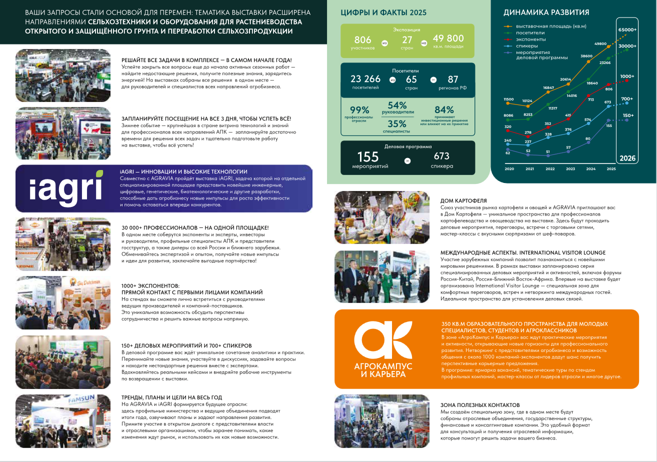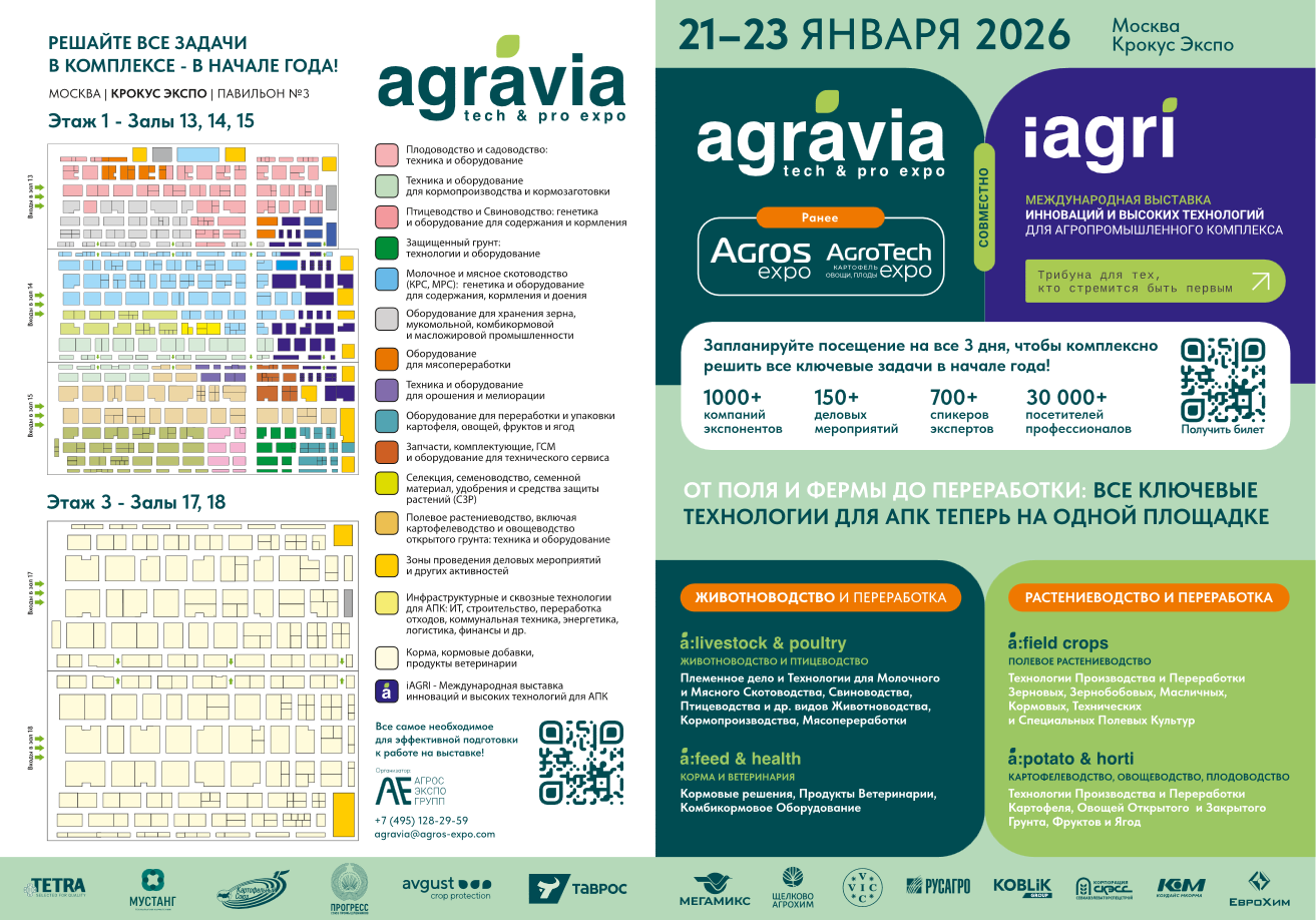 Важным нововведением 2026 года становится совместное с АГРАВИЯ проведение специализированной выставки iАГРИ. Её цель – создание среды для междисциплинарного сотрудничества между государственными структурами, агробизнесом, IT-компаниями, научными центрами и инвесторами для стимулирования создания и внедрения отечественных высокотехнологичных решений.